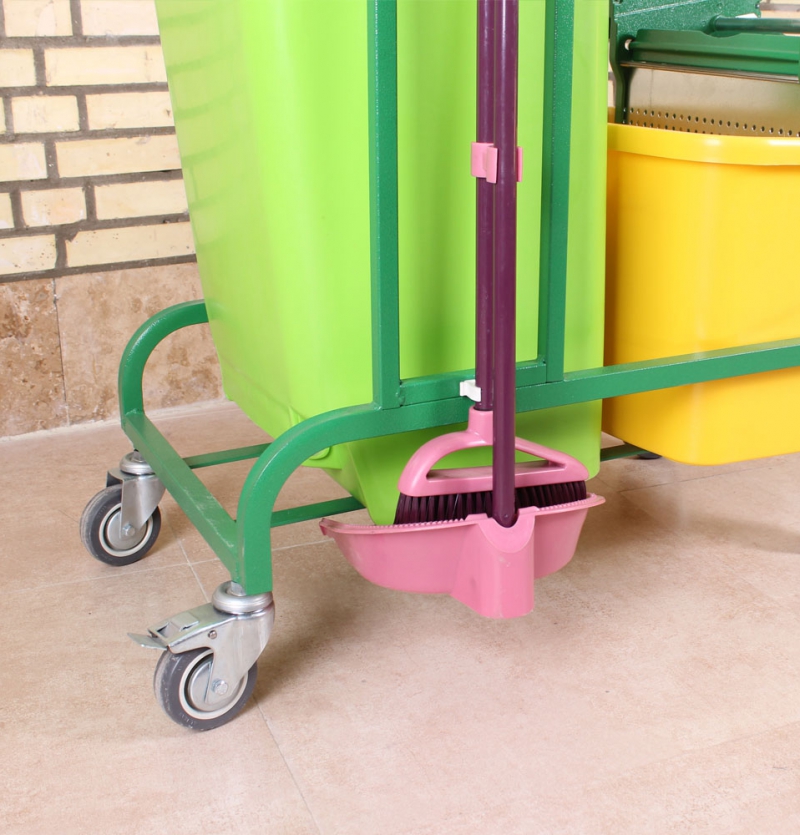 ترالی نظافتی دارای تی شوی تک سطل و سطل زباله 120 لیتری ؛شاسی کاملا فلزی با رنگ کوره ای و چرخ صنعتی با قطر 10سانتی متر