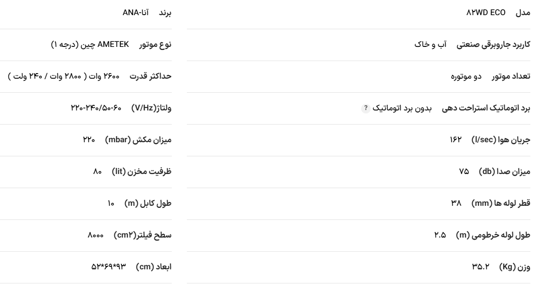 جاروبرقی صنعتی آب و خاک دو موتوره آنا مدل 82WD ECO دارای ۲ موتور ۱۳۰۰ وات AMETEK و حداکثر مکش ۲۶۰۰ وات برای استفاده در محیط‌های صنعتی و تجاری طراحی شده است . این دستگاه با قدرت مکش بالا و عملکرد بی‌صدا، می‌تواند به آسانی گرد و غبار، زباله و مواد زائد را جمع‌آوری کند و در رده جاروهای سری eco ( اکونومی) بهترین مکنده صنعتی برای اماکن تا مساحت زیر ۶۰۰ متر مربع و با میزان کار متوسط می باشد. موتورهای قدرتمند آن تضمینی برای انجام سریع‌تر و موثرتر کارهای نظافتی در مقیاس وسیع هستند. با طراحی ارگونومیک و کاربری آسان، این جاروبرقی به یکی از انتخاب‌های اصلی در صنایع مختلف تبدیل شده است.