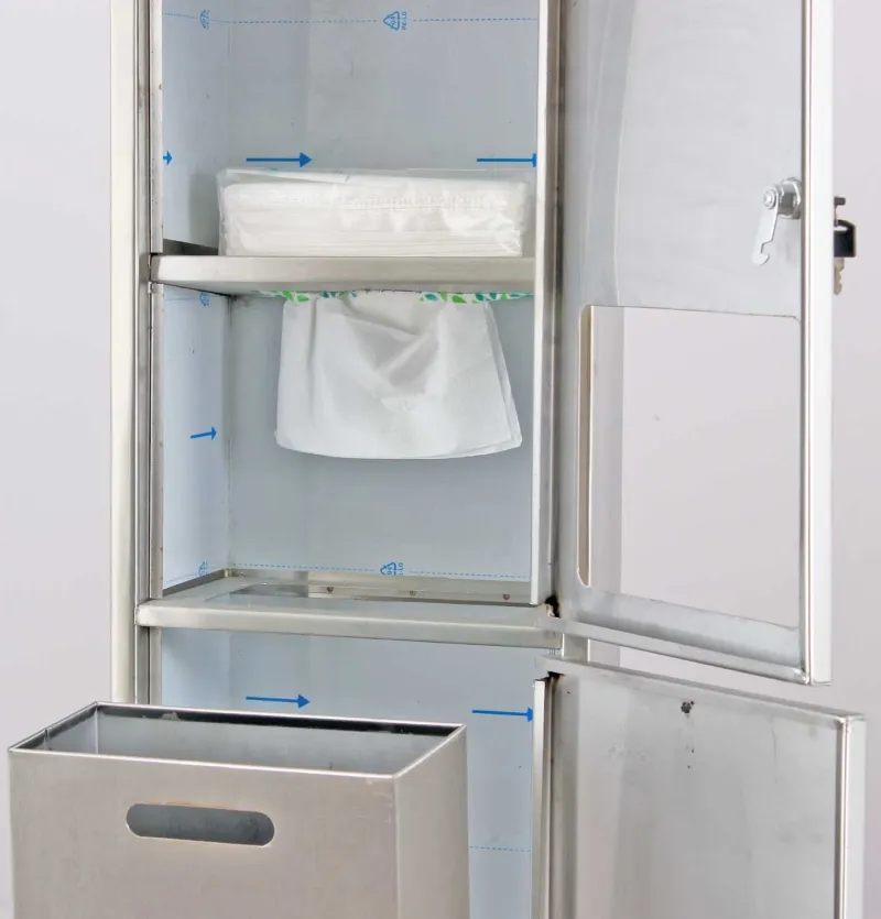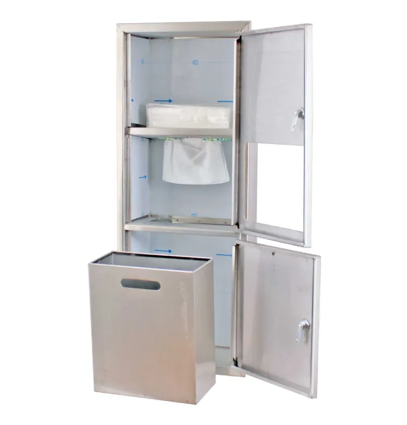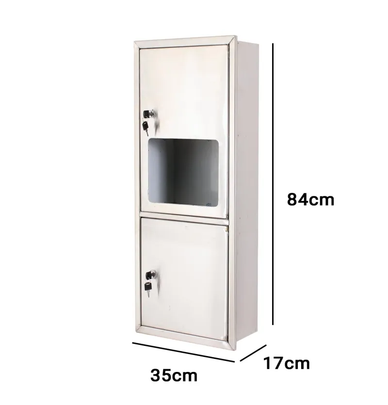 مخزن دستمال کاغذی و سطل زباله توکار تمام استیل فلزی دارای درب قفل دار بوده و دریچه ی قرار گرفته در قسمت جلویی محصول جهت برداشتن دستمال کاغذی از داخل مخزن میباشد. سطل داخلی مخزن نیز کاملا از جنس استیل بوده و به راحتی جهت تخلیه میتوان آن را جابجا نمود.