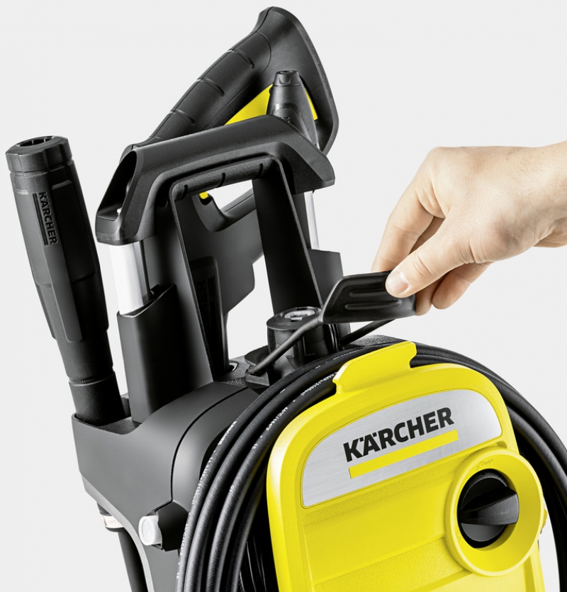 شما میتوانید پس از استفاده از دستگاه، شلنگ فشار قوی آن را به راحتی در قسمت مخصوصی در جلوی دستگاه جمع کنید و به کمک یک بند لاستیکی آن را محکم کنید. اندازه کوچک این دستگاه، جابجایی و استفاده از آن را بسیار آسان میکند. همچنین شما میتوانید آن را به سادگی در هر جایی نگهداری کنید. دسته تلسکوپی این کارواش کارچر مدل K 5 ، امکان تنظیم ارتفاع دستگاه را دارد. امکان استفاده از دستگاه به صورت عمودی یا افقی کار نظافت را آسان تر میکند. این دستگاه همچنین میتواند به راحتی و به سرعت به شلنگ فشار قوی ۸ متری دستگاه وصل شود.
