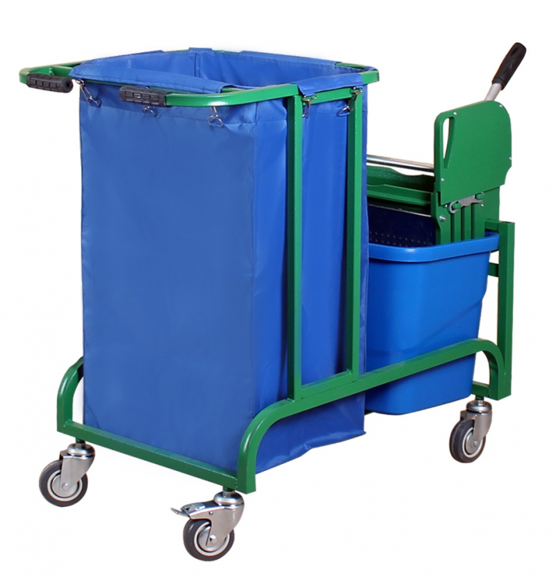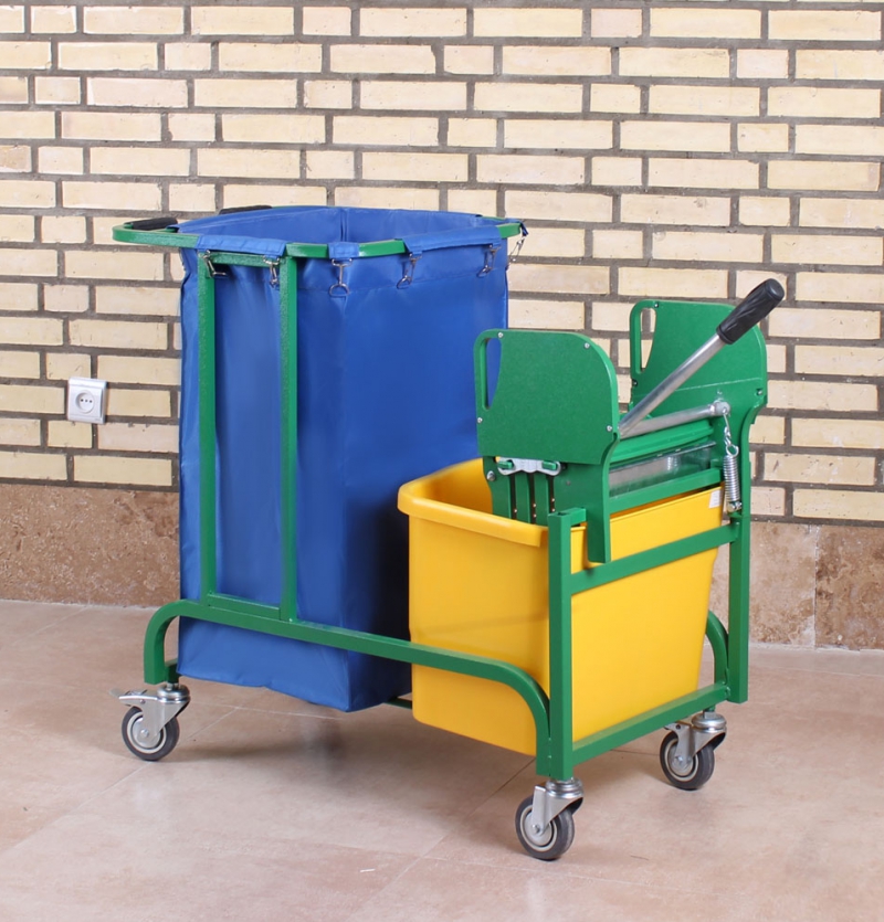 ترولی نظافت پرتابل مناسب جهت شستن تی و جمع آوری زباله و یا ملحفه همزمان دارای شاسی کاملا فلزی و برزنت جدا شونده