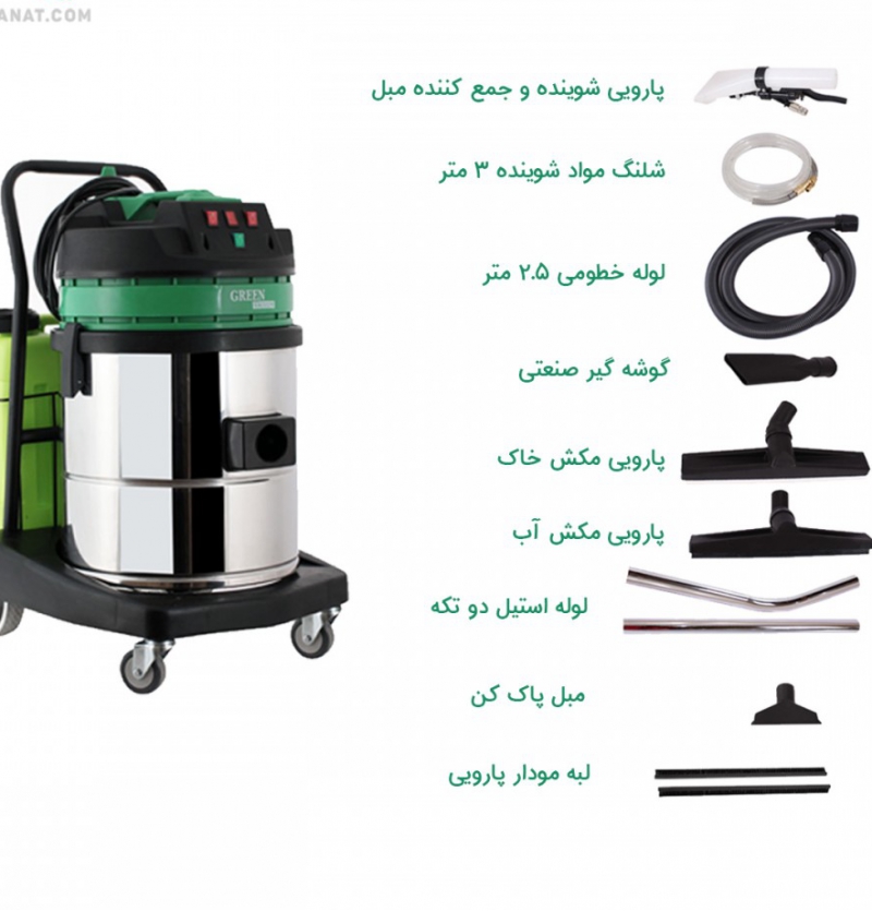 دستگاه مبل شوی صنعتی دو موتوره ، دارای دو موتور قدرتمند، دارای پارویی مخصوص مبل شویی ، مخزن مواد شوینده با ظرفیت 20 لیتر و قابلیت جمع آوری آب و خاک، دارای قابلیت استفاده هم به عنوان مبل شوی صنعتی هم جاروبرقی صنعتی میباشد.