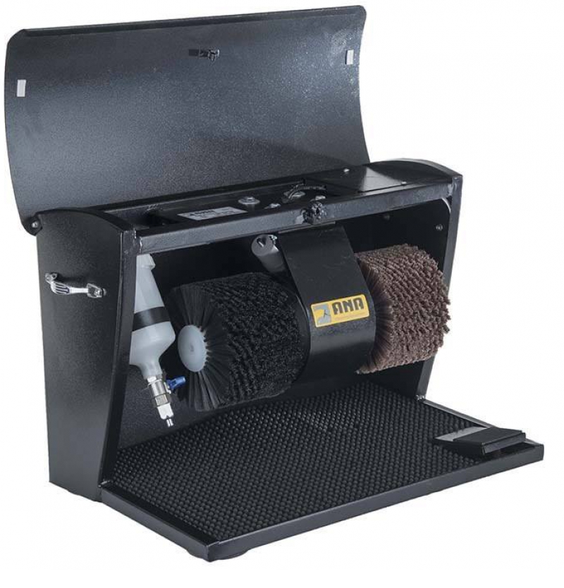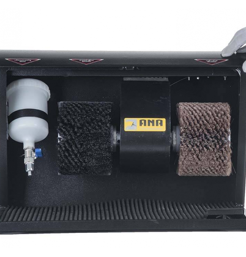 دستگاه واکس کفش آنا با بهره گیری از موتور استاندارد الکتروژن دارای دو برس گرد گیر و براق کننده و یک شیر مکانیکی جهت واکس بیرنگ ، سیستم روشنایی ، سیستم پدال روشن و خاموش دستگاه ،کابین فلزی با رنگ پودری الکترواستاتیک