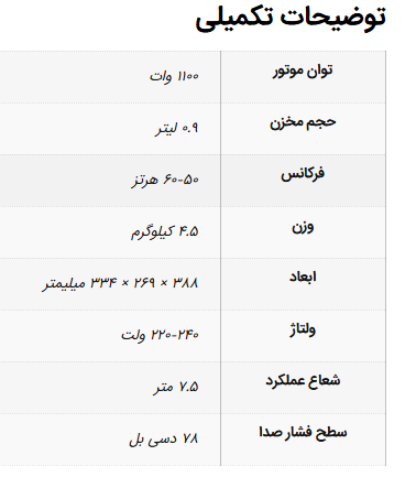 میزان صدای این دستگاه جاروبرقی خاک ۷۶ دسی بل است و توان و میزان قدرت مکش دستگاه بالا بوده و به ترتیب ۱۳۰۰ وات و ۱۹ کیلو پاسکال است که این میزان توان موتور و قدرت مکش برای مصارف خانگی مناسب است.