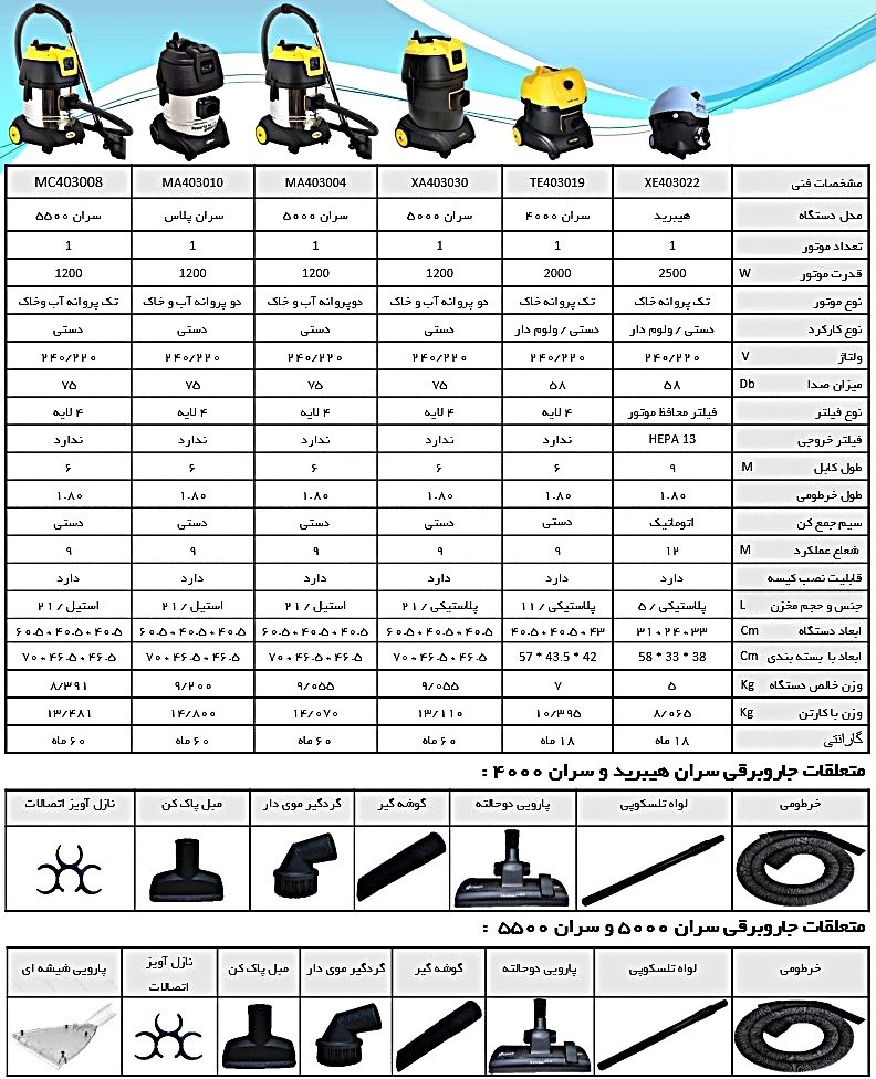 جاروبرقی تک موتوره تر و خشک سران مدل 5000، جاروبرقی قدرتمند و کاربردی برای مصارف خانگی، نیمهصنعتی و تجاری است، این دستگاه با موتور پرقدرت 1200 وات از برند AMETEK، امکان جمعآوری زبالههای خشک و مایعات را فراهم کرده و به لطف مخزن ۲۰ لیتری استیل ضدزنگ، ظرفیت بالایی برای نظافت محیطهای مختلف دارد. فیلتر نمدی قابل شستوشو و امکان نصب فیلترهای کارتریجی و هپا، آن را برای استفاده در محیطهای صنعتی و بهداشتی به گزینهای مطمئن تبدیل میکند. این جاروبرقی علاوه بر عملکرد عالی، دارای ۶۰ ماه ضمانت تعویض موتور و ۱۵ سال خدمات پس از فروش است که خیال خریداران را از نظر کیفیت و دوام دستگاه راحت میکند. قابلیت افزایش طول خرطومی تا ۱۰ متر، سیستم ضد الکتریسیته ساکن و امکان استفاده از کیسه دائمی یا پاکت یکبار مصرف از دیگر ویژگیهای برجسته این مدل هستند. از نظافت مساجد و مدارس گرفته تا کارواشها، قالیشوییها و آشپزخانههای صنعتی، این دستگاه عملکردی عالی و بدون نقص ارائه میدهد. این جاروبرقی به عنوان جاروبرقی مسجدی هم استفاده می شود.