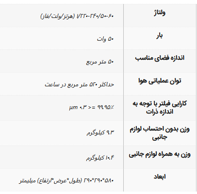 دستگاه تصفیه هوای AF 50، با استفاده از تکنولوژی لیزر، داشتن حالت اوتوماتیک، فیلتر H 13 و فیلتراسیون کربن فعال توان از بین بردن تمام عوامل بیماری‌زا، بوی نامطبوع، ذرات گرد و غبار و آلرژی‌زا در فضای ۵۰ تا ۱۰۰ متر مربع را دارد.