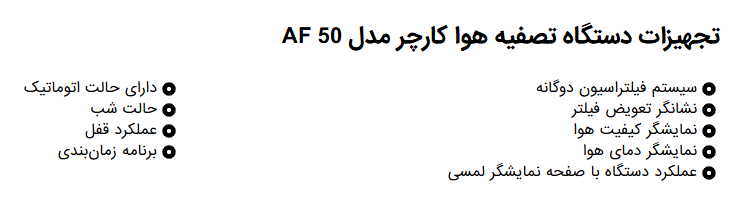 دستگاه تصفیه هوای AF50 کارچر، با استفاده از به‌روزترین تکنولوژی لیزری دنیا، امکان اجرای کار در حالت اتوماتیک با تشخیص خودکار آلودگی محیط، مجهز به فیلتر هپا H 13 و فیلتراسیون کربن فعال که با یونِ نقره پوشیده شده است، توان از بین بردن تمام عوامل بیماری‌زا، زیرذرات ایجادکننده‌ی بوی نامطبوع، ذرات نادیدنی گرد و غبار و ریزذرات آلرژی‌زا در فضایی با مساحت ۵۰ تا ۱۰۰ متر مربع را دارد. دستگاه تصفیه هوای ای اف پنجاه کرشر برای تصفیه‌ی هوای اتاق‌های بزرگ، هال، ادارات، کافی‌شاپ‌های محلی، بوتیک‌ها و… دستگاهی مناسب است. دستگاه تصفیه هوای AF 50 با استفاده از سیستم فیلتراسیون چند لایه، ذرات آلرژی‌زا و آلودگی را در چند مرحله و بسته به ابعاد ذرات جذب می‌کند تا هوایی پاکیزه برای تنفس شما مهیّا کند. در کنار فیلتر کربن فعال، نمایشگر کیفیت هوا به صورت حروف عددی، نشانگر کیفیت هوا به صورت رنگی و نشانگرهای دقیق دما و رطوبت نسبی از دیگر امکانات این دستگاه تصفیه‌ی هوا هستند.