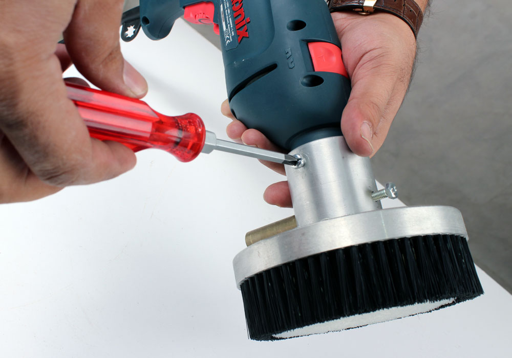 همچنین سری دریلی مجهز به محل اتصال شلنگ کف و مواد شوینده خروجی از دستگاه میباشد ، شلنگ و مواد شوینده به سری دریلی دستگاه متصل شده و آب و کف مواد شوینده بر روی برس شستشو سرریز شده و توسط گردش برس روی پارچه مبل یا سطح مورد نظر را برس میزند.