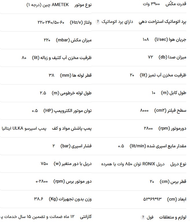 مکش و جمع آوری پساب کثیف با 3 عدد موتور دو پروانه Ametek با قدرت حداکثر 4200 وات / 240 ولت